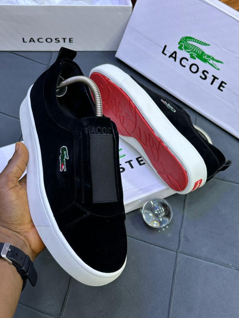 Clean, sporty, and effortlessly stylish—these Lacoste Men’s Black Suede Sneakers are designed for men who appreciate premium casual footwear with a refined edge. Featuring a soft black suede upper, the iconic crocodile logo, and a striking red sole detail, they deliver a bold yet sophisticated designer-inspired look.